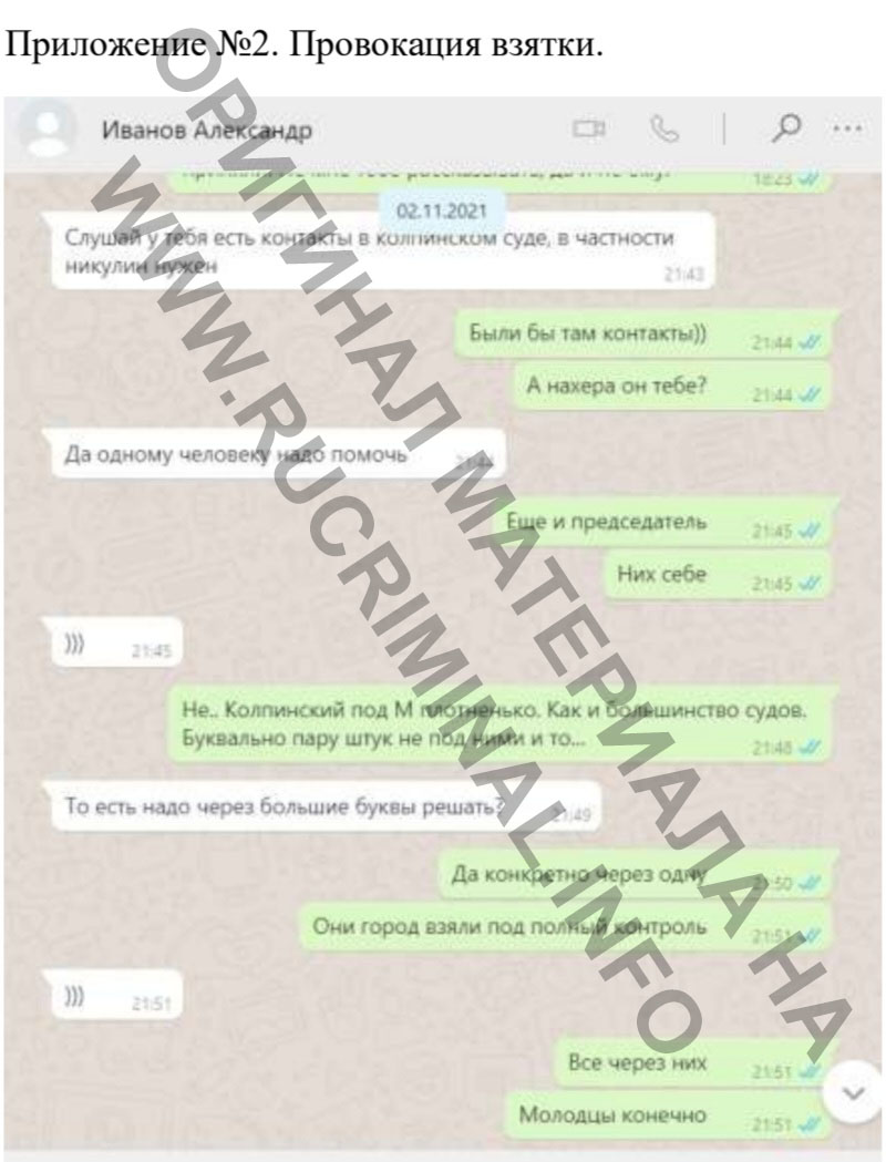«Вотсап», используя телефонный номер мессенджера….., с просьбой оказать содействие в «решении вопросов» в Колпинском районном суде, а именно найти «выход» на Председателя Колпинского районного суда – Никулина Д.Г. Фото переписки я прикладывал ранее в заявлении.